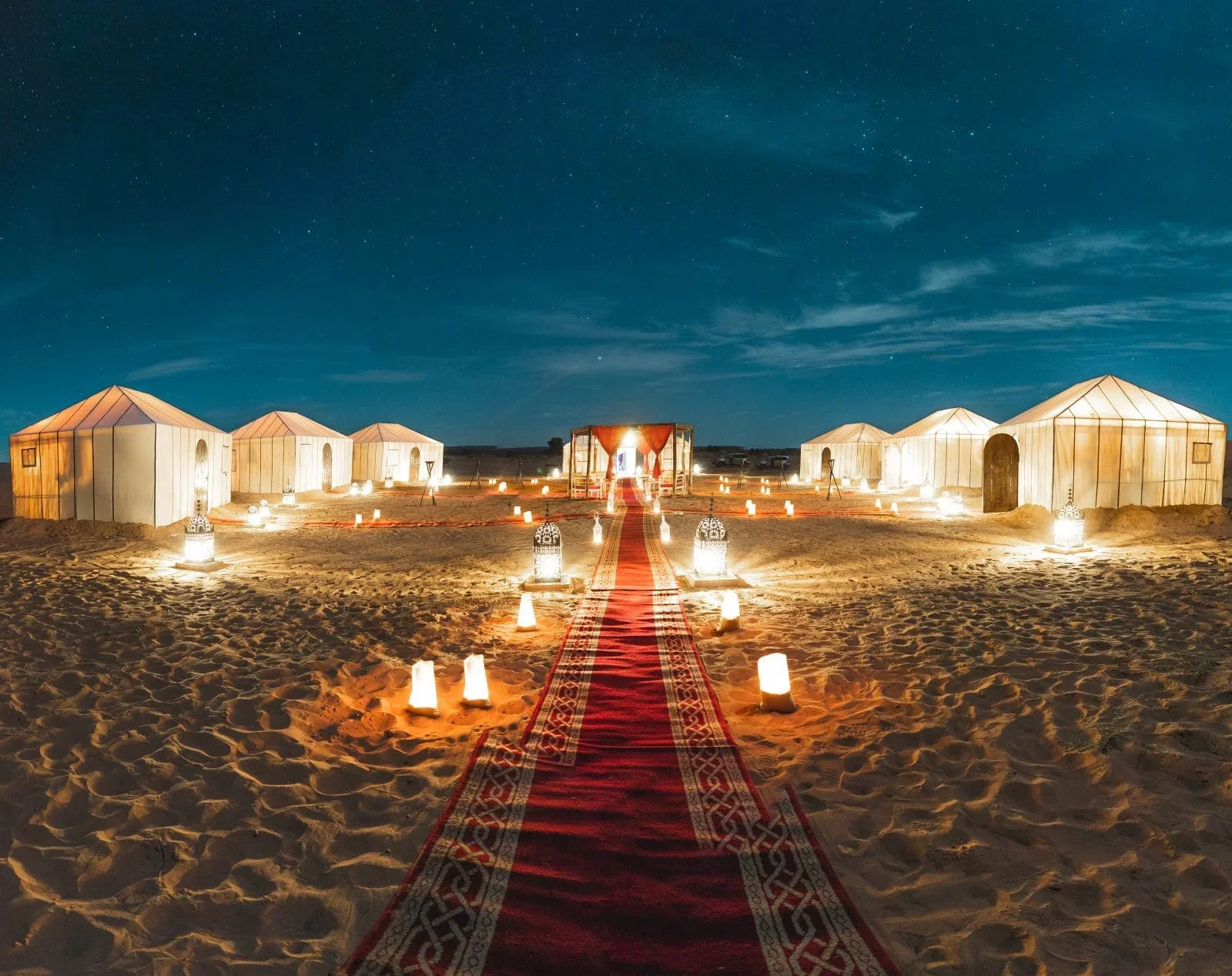 In de Sahara slaap je in een kleinschalig woestijnkamp, midden in de stilte. ’s Avonds brandt het kampvuur, drink je thee met de woestijnfamilies en zie je de Melkweg helder boven je. Geen lichtvervuiling, geen geluid, alleen totale rust. Je slaapt in een eenvoudige maar sfeervolle tent, of als je wilt gewoon onder de open sterrenhemel.