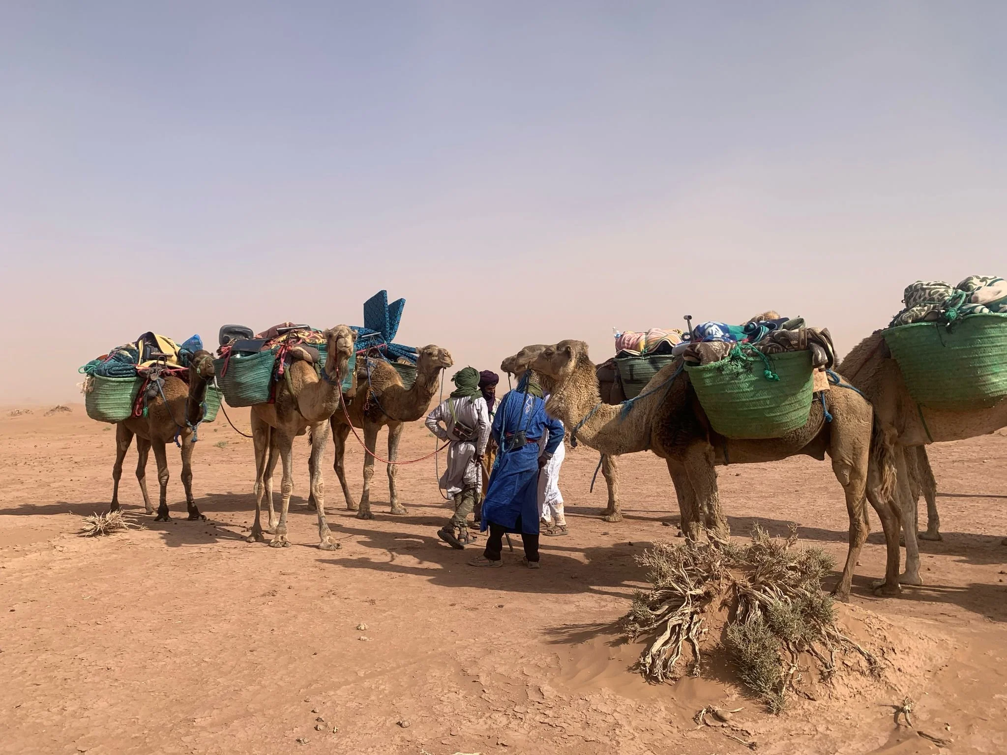 Daarnaast loopt er een klein team mee dat zorgt voor de logistiek: een jeep met kampeeruitrusting, water en eten én een kameelbegeleider met lastkamelen die het kampmateriaal vervoeren.