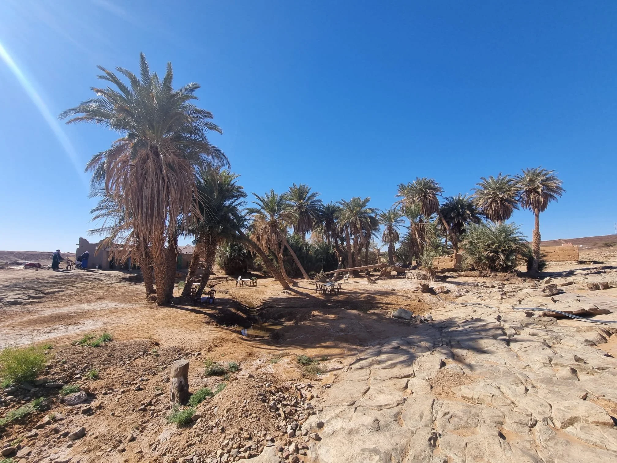 Omdat we ons op de noordrand van de Sahara bevinden, lopen we door een mozaïek van landschappen: van droge rivierbeddingen en steenachtige vlaktes, tot oases met palmbomen, groene struiken en steppegebieden. Langzaam verandert alles, de lucht, de kleuren, de grond, tot we uiteindelijk tussen de echte zandduinen staan.